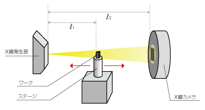 X線発生部とイメージ管の間にワークを置く事で、X線が遮蔽され影が生じ、X線カメラでその影を拾ってX線像を得ます。その時の幾何像倍率は、X線発生部からワークまでの距離 l1 と発生部からX線カメラまでの距離 l2 によって、次のような関係になります。